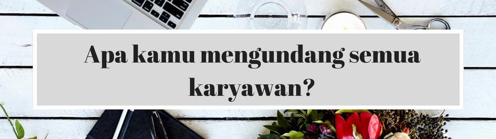 "Jika mengundang hampir setengah dari jumlah karyawan kantor, atau setengah dari jumlah karyawan di kantor yang kecil, kamu perlu mengundang semua orang," ujar perempuan yang juga presiden dan pemilik Mannersmith Etiquette Consulting. Kalau hanya mengundang kurang dari sepertiga karyawan di kantor, kamu nggak perlu mengundang semua orang.