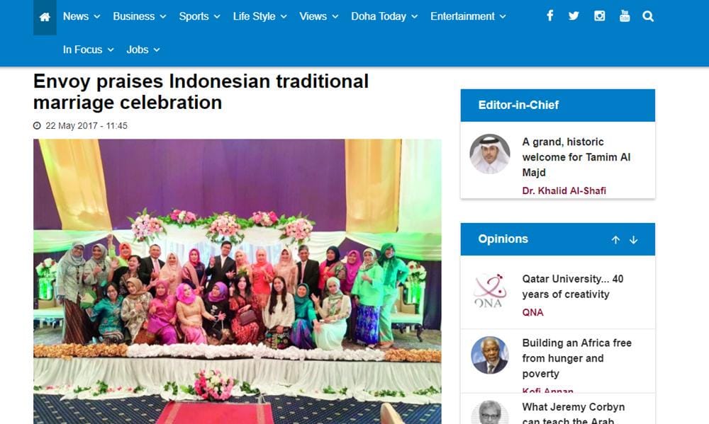 The Peninsula Qatar merupakan salah satu situs berita harian di Timur Tengah. Pada pertengahan 2017 ini, mereka menulis artikel di mana duta besar Indonesia untuk Qatar menghadiri sebuah pernikahan Indonesia yang diselenggarakan di Qatar dan dibantu oleh komunitas di sana. Menurut perwakilan dari duta besar Qatar, pernikahan tradisional ini bisa membantu mempromosikan kebudayaan Indonesia di kancah mancanegara, termasuk Qatar.