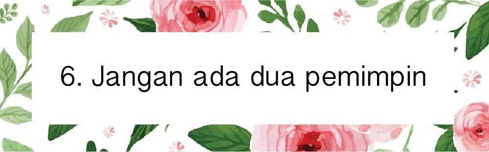 Dalam rumah tangga pemimpin adalah suami. Kamu harus tahu betul bagaimana karakter pasangan yang kamu miliki. Ketika kamu dan pasangan memiliki ego yang sama-sama keras, risikonya hubunganmu akan selalu dalam masalah berat saat menghadapi masalah. Bagaimanapun kepala rumah tangga adalah suami. Seorang pasangan harus benar-benar tahu apa saja tanggung jawab yang dimiliki. Untuk masalah kepemimpinan laki-lakilah harus yang lebih dominan. Kalau dua-duanya ingin berusaha memimpin dan mengatur, malah akan berujung pertengkaran.