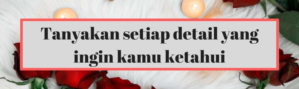 Seperti apakah tanggal yang kamu pilih untuk menggelar pernikahan masih kosong? Apakah ada biaya tambahan lainnya yang perlu dikeluarkan? Berapa lama waktu yang diperlukan untuk memersiapkan dekorasi tempat? Selain itu, jangan lupa pertanyaan mengenai back-up plan. Back-up plan bukan hanya direncanakan bagi pasangan yang menggunakan konsep outdoor, tetapi juga untuk konsep indoor. Misalnya jika listrik padam pada hari-H, apakah ada tersedia mesin pembangkit listrik yang dapat digunakan? Jika kamu menggunakan konsep outdoor, apakah ada tempat yang bisa digunakan jika hujan turun saat hari-H? Jangan malu untuk bertanya tentang semua hal yang perlu kamu tanyakan ya, Bela.