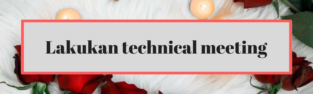 Sebisa mungkin lakukan technical meeting di lokasi yang kamu pesan sehingga para vendor dapat memelajari lokasi tersebut sebelum hari–H. Terakhir, datanglah ke lokasi 1-2 hari sebelum acara, sekadar untuk memastikan segalanya berjalan dengan sempurna.