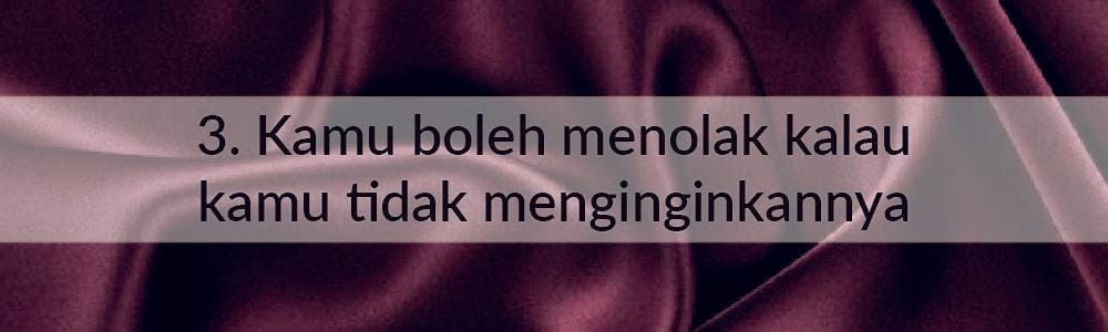 Ketika kamu berhubungan seks, kamu seperti memiliki kewajiban untuk melakukan hal-hal yang menggairahkan bagi pasanganmu. Padahal, ketika kamu sedang eggan berhubungan, yang terjadi adalah seakan kamu seperti terpaksa untuk melakukannya. Kesenanganmu dalam seks adalah pilihanmu. Ketika kamu rasa kamu nggak ingin melakukannya, jangan paksakan dirimu. Berhubungan seks adalah pilihanmu, bukan sebuah paksaan.