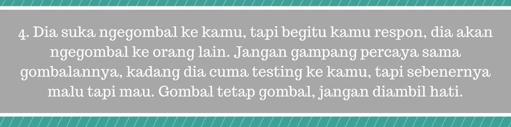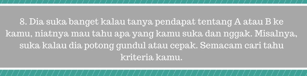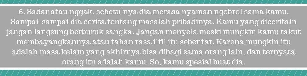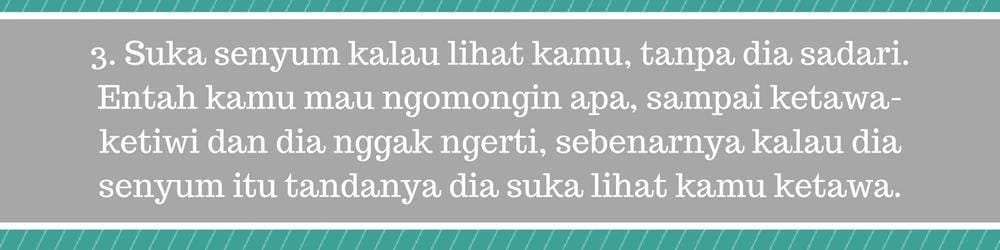 Ini nih tanda-tanda yang bikin kontroversi. Kalau kamu curhatin ke temen sih nggak mempan. Antara teman kamu percaya apa nggak, kadang malah ngeledekin kamu ke PD-an. Yang nyebelin lagi, mereka akhirnya bilang kalau kamu cuma di-PHPin. Sudah deh diresapi pakai feeling. Love? Just feel it.