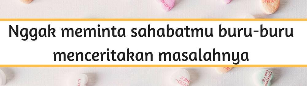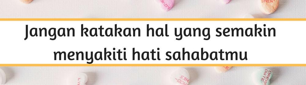 Saat sahabat mulai menceritakan masalahnya, dengarkan dia dan tempatkan dirimu seolah berada di posisinya. Hindari perkataan-perkataan yang membuat dirinya tambah tersudut. Misalnya kalimat “Kalau saja dulu kamu nggak begitu, pasti….”, “Harusnya ini nggak terjadi jika kamu mendengarkan aku,” atau kalimat-kalimat sejenis karena dikhawatirkan itu akan menimbulkan penyesalan dan membuat bebannya semakin bertambah.