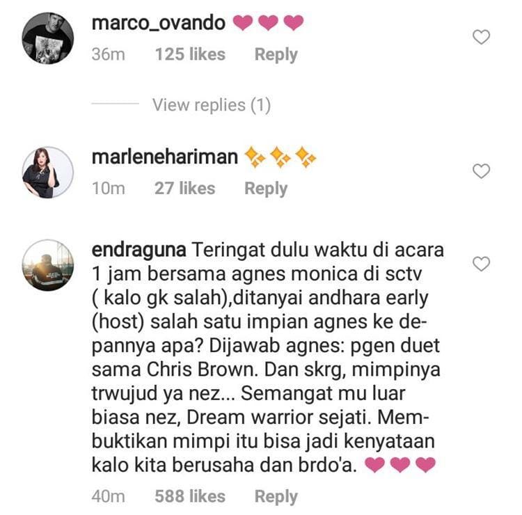 Video tanpa suara tersebut langsung dibanjiri komentar dari para penggemar di seluruh dunia, nggak terkecuali dari Indonesia. Dari beberapa komentar tersebut, ada satu komentar yang menarik perhatian yang ditulis oleh akun @endraguna. Akun tersebut menulis bahwa salah satu impian Agnez di masa lalu adalah bisa berduet dengan Chris Brown.