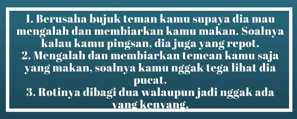 4. Kamu sama temanmu lagi jalan berdua, tiba–tiba di tengah jalan, kalian sama – sama lapar banget. Tapi apesnya ternyata kalian lupa bawa duit. Cuma ada recehan yang cukup buat beli satu porsi. Apa yang bakal kamu lakuin?