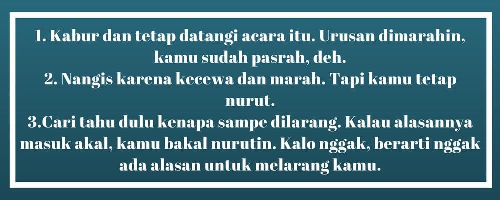 6. Kamu pingin banget datang ke suatu acara, tapi kamu nggak diizinin sama dia. Apa yang kamu lakukan ?