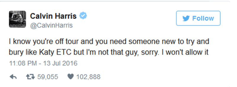 Calvin merasa bahwa selama ini Taylor mengabaikan sahabat dan mantannya karena sibuk mencari teman dan pasangan baru. Salah satu tweet yang cukup menohok yaitu ketika Calvin menyebut nama Katy Perry. “Aku tahu kamu sedang nggak sibuk tur dan membutuhkan sesuatu yang baru dan meninggalkan Katy dan yang lain, tapi bukan aku, maaf saja. Aku nggak akan membiarkan itu terjadi.”