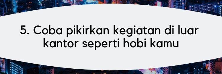 Ketika anda tidak berada di kantor, buatlah kegiatan yang membuat kamu merasa bahagia seperti melakukan hobi yang kamu sukai. Nah, saat itu lah kamu mulai bisa melupakan sesuatu yang berhubungan dengan masalah yang ada di kantor terutama rekan kerja yang kamu sukai itu.
