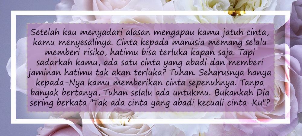 Pikiran selalu gagal menerangkan perihal cinta. Kamu hanya mampu merasakan bahwa cinta adalah kenikmatan tak terhingga. Hanya saja kita tidak mengetahui bahwa cinta yang membuat kita bahagia, bisa saja membuat kita tak berdaya dan mengubah kita menjadi seorang yang bersedih. Ya, tak lagi bahagia seperti saat pertama kita merasakan kehadiran cinta.