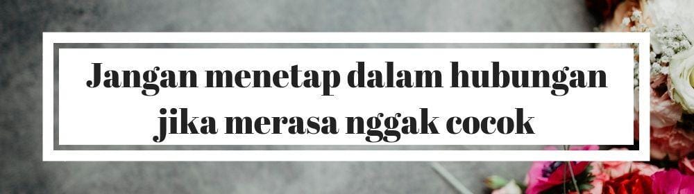Jika nggak cocok dengan seseorang, jangan menjalin hubungan atau jangan menetap dalam hubungan itu jika sudah dimulai. Ingat kalau kamu nggak selalu punya chemistry dengan setiap laki-laki yang dirimu temui. Untuk menemukan hubungan yang benar-benar diinginkan, tentu kamu perlu melakukan uji coba terlebih dahulu. Jika nggak cocok, jangan memaksakan diri. Sebab, sekali menetap atau berkomitmen, tandanya kamu memberikan cinta pada pasangan dan menerima hal yang sama dari pasangan.