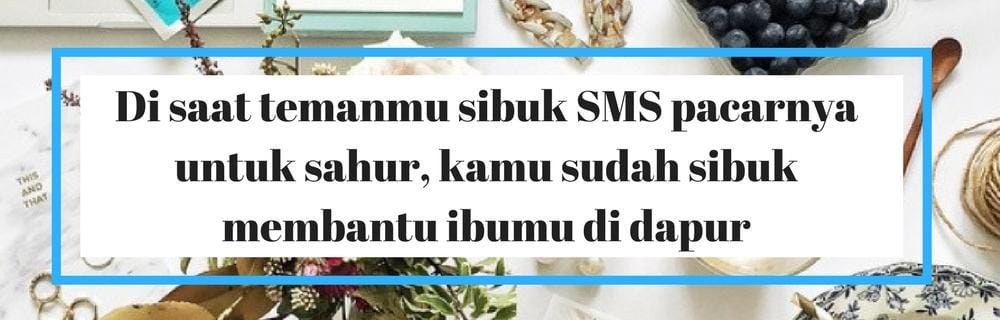 Temanmu yang punya pacar sedang sibuk membangunkan pacarnya untuk sahur, sedangkan kamu sudah sibuk dengan bahan makanan yang harus dimasak. Kamu memilih melakukan kebaikan di bulan penuh berkah dengan membantu ibumu, dibanding hanya tiduran dengan memegang handphone untuk membangunkan sang pacar.